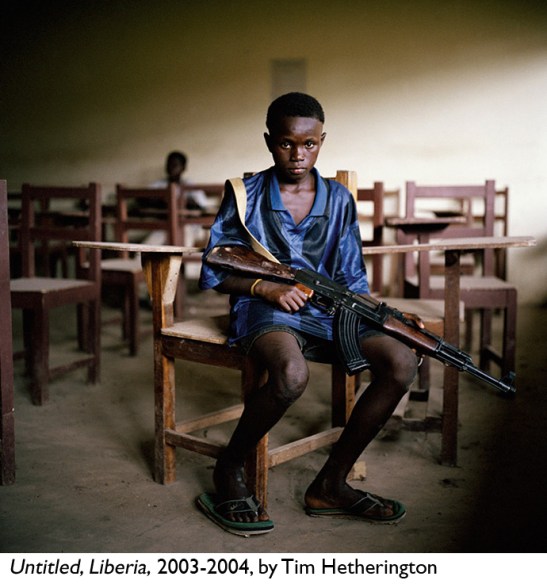 What does this mean for the work, though? Clearly there’s a tension between the values of the art market and those of the social documentarian. I recently went to the new Yossi Milo Gallery in Chelsea to see a show of photographs by Tim Hetherington, the war photographer who was killed last year in Libya. I admire Hetherington’s work, but even so it a bit felt jarring to see his images of Liberian child soldiers and decrepit hospitals commodified into beautiful 4′ x 4′ art prints. The contrast between the dirty-colorful, poverty-stricken Liberian landscape and the perfect white walls of the gallery was ironic to say the least.