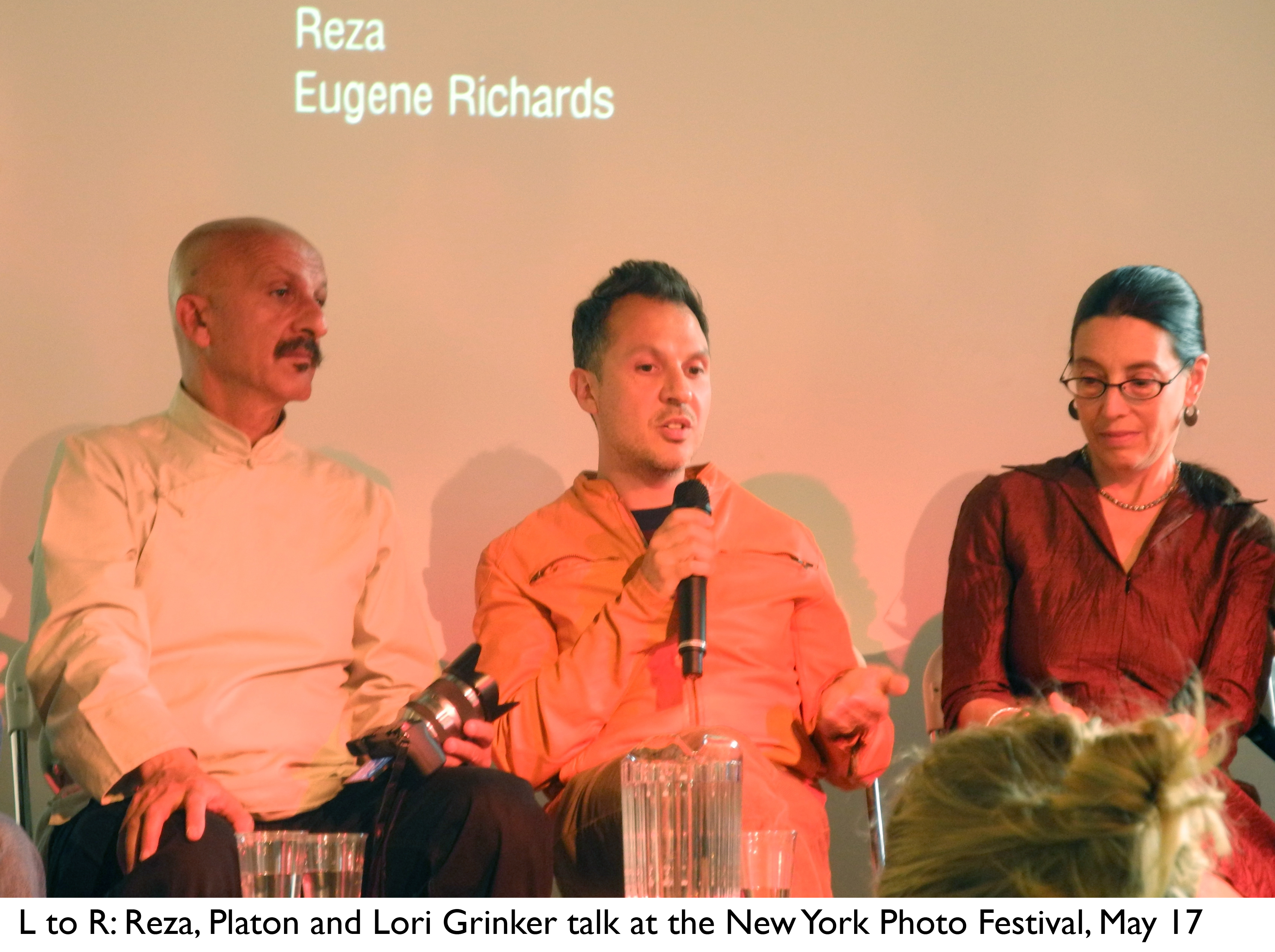In a panel discussion on Thursday night, five photographers from The Razor’s Edge hashed out some of the issues in the art versus documentary debate. Lori Grinker talked about how she uses graphic elements to draw viewers into an image, saying, “I often think of people passing something by every day and not noticing it.” National Geographic photographer Reza (who will be played by Sir Ben Kingsley in the movie of his life) said his images “have to really impress people, so I make them simple.” Richards talked about the emotional pull of color, which he discovered recently while making images for his book about abandoned homes, The Blue Room.