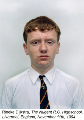 The Dutch photographer Rineke Dijkstra, whose mid-career retrospective is currently on show at the Guggenheim Museum New York, is also fascinated by the complexities of youth and adolescence. To be honest, when Dijkstra first burst onto the art photography scene in the early 1990s, I thought she was overrated. There was a lot of gushing about her portrait series of children and adolescents on beaches—with breathless comparisons between the image below and Botticelli’s Birth of Venus—but I found many of the portraits static and uninteresting. A few years later, I saw her series on bullfighters and new mothers at the Photographers Gallery in London. These portraits were fresher and more surprising, but I still found Dijkstra’s approach a bit clinical and academic for my taste.