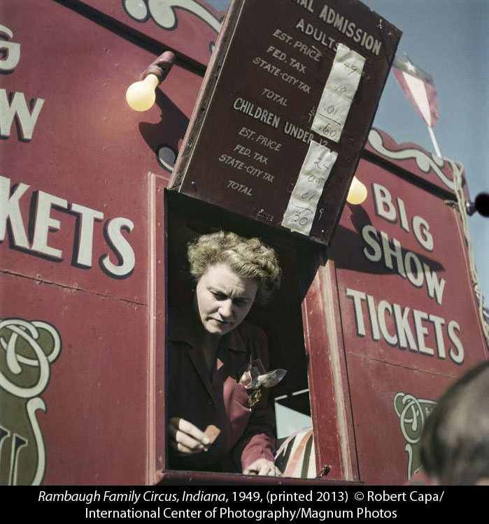 The answers to those questions are, respectively: not really, and, maybe a little. Capa’s color work is patchy, for several reasons, including the slow speed of color film (the first Kodachrome was 10 ASA), his own difficulty mastering some technical aspects, and the fact that he was given some uninspiring assignments by editors. But there’s enough very good work here—like his brief documentation of a family circus in Indiana—to show that he saw well in color.