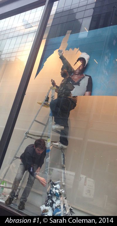 from the large museum windows. I stopped to watch: the photographs on the windows were in an interesting stage of semi-disappearance, bits of faces and houses hanging on while other scraps of the same images lay curled on the floor. I couldn’t resist documenting the scene, though I only had my iPhone: the peeling-away of layers (and the cultural significance of an African-American removing a portrait of a “drowning” African man) seemed at least as interesting as what was going on downstairs in the museum. Maybe, just maybe, if I described them as “images that meditate on time and transiency through the abrasion and removal of previously whole photographs,” I could sell these “depictions of old-fashioned labor memorialized with the spontaneity of digital capture.” What do you think?