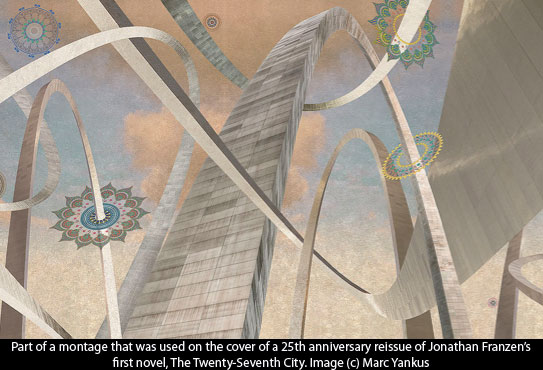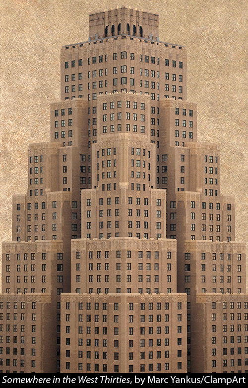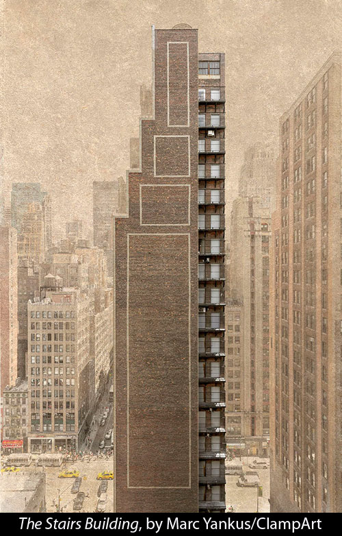 The Space Between mixes realism and fantasy, contemporary and historical, the grand and the mundane. While the buildings Yankus depicts are all real ones in New York, he has manipulated the images, fading out surrounding buildings and adding a textured sky that gives the image a feeling of an old sepia print or an architectural rendering. At times, when a building was incompletely visible in his initial photograph, he has removed surrounding buildings and recreated its hidden parts. The result is an intriguing combination of known and unknown elements, like something you might encounter in a dream.