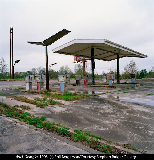 After reading that passage, look at any number of Bergerson’s images (the abandoned gas station, for example, or a forsaken storefront in Birmingham, Alabama with an old sign reading, “School Uniform on Sale” and a blanket-wrapped homeless body in front) and they may take on new levels of meaning.