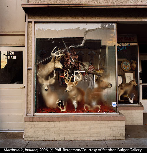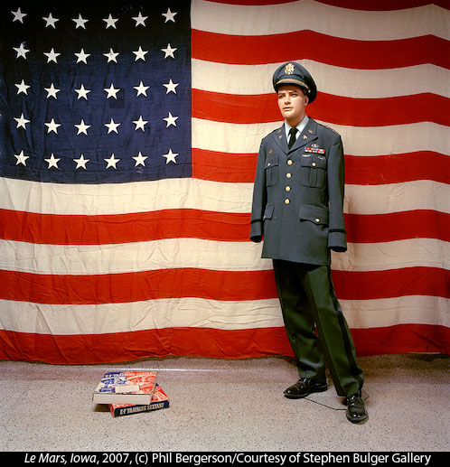 But if Bergerson is attuned to these kinds of revealing scenarios, he also has en eye for small, easy-to-overlook details that speak volumes. One pathos-filled image in the book shows a lost-looking armless mannequin in Naval uniform standing in front of an American flag. In another, of retouched and restored photographs in a shop window, a photograph of a pretty young woman trumpets proudly that it is “Fixed,” while another, of an African-American man, reads, “Colorized.” The lack of social awareness in these displays is stunning, but it also signals a kind of innocence that is almost touching.