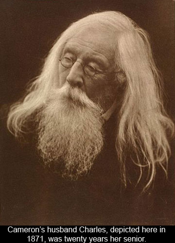There is also a wonderful portrait of Cameron’s husband Charles (above), with his flowing white hair and beard, in which he is not playing the role of King Lear or Merlin (as Cameron often conscripted him to), but rather is lost in thought behind small round spectacles. He looks gentle and wise, and as much the dignified intellectual as any of the “power trio” of Darwin, Tennyson and Browning, whose portraits by Cameron adorn a nearby wall.