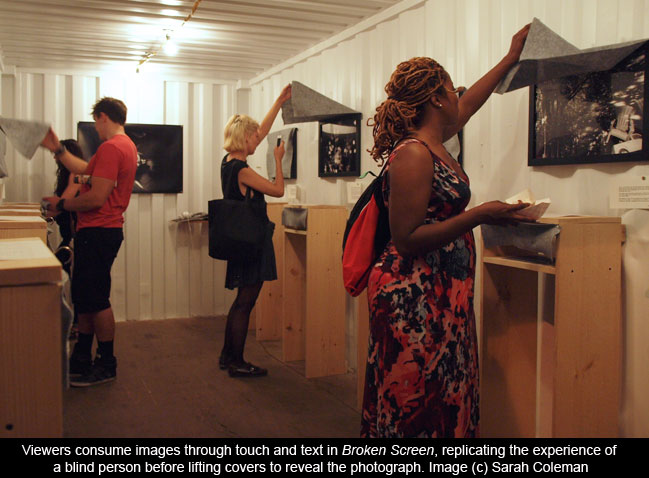 I’ve loved Photoville since its first year , for its casual vibe and democratic feel, and for the ironic way that exhibiting work in shipping containers forces photographers to think outside the box. The sense of creativity was alive and well this year, with unusual exhibits including Broken Screen , where viewers were asked to experience images through touch and text rather than sight, and How Can I Help? , a faux-psychologist’s office where people could sign up for a fifteen-minute “sincere and creative interpretation” of a personal issue by photographer Saul Robbins and others.