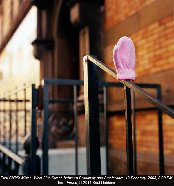 The focus on detail came naturally to Robbins, whose previous work had been concerned with isolating objects and gestures. In his series This Life So Far , he documented small, everyday gestures of family members and friends in order to explore “the depth of expression contained in the simplest of situations.” In Found , he reinterpreted a Jewish edict to reunite owners with lost property, painstakingly photographing lost gloves, then retrieving them and taking them home to be washed, leaving behind a note with his phone number and email address.