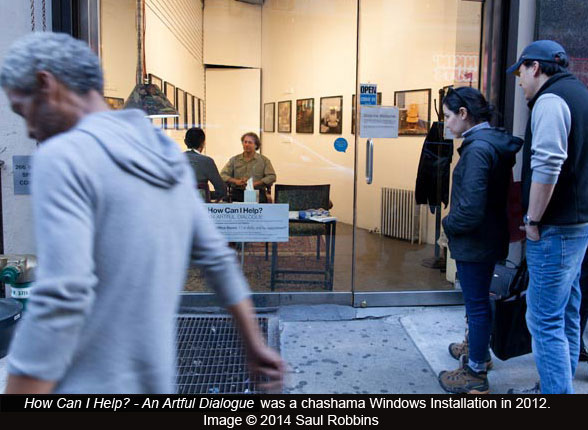 But it wasn’t until Initial Intake that Robbins started considering a more active engagement with viewers. Realizing he liked interacting with people, he envisaged some sort of dialogue around the work. When he heard about the organization chashama , which provides non-traditional spaces for artists to do new work, the idea for How Can I Help? was born. “The possibility of using my art in multiple ways, going beyond the purely visual, was interesting,” he says.