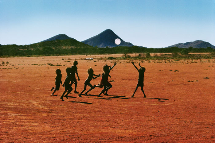 I love the one [above] of her walking to Docker River with all the children dancing around her. There’s a picture of a ghost gum tree late in the day, these red branches lit up by the setting sun. And there’s one of Aboriginal children jumping with a balloon: that one has an interesting backstory. I had two cameras: one camera set for Tri-X 400 ASA, and the other for Kodachrome 64 ASA. One day I mistakenly put color in the black-and-white camera. I saw these kids playing with the balloon, got that frame, and knew it was one of the best pictures I’d ever shot. Then I looked down and I realized I’d underexposed it by five stops. This was Kodachrome, which gives you maybe a quarter of a stop margin, half a stop if you’re lucky. When it was developed, that frame was so dark you could barely see it. And I was so heartbroken that I stuck it in a safe-deposit box in 1978—then when we did this book, I pulled it out and called a friend at Adobe, and said, Is there any way you could save this? And they did—which makes me love it even more. I can’t believe I actually had the wherewithal, as a kid, to think, Someday they’ll have a way to fix this. I just couldn’t bear to throw it away.