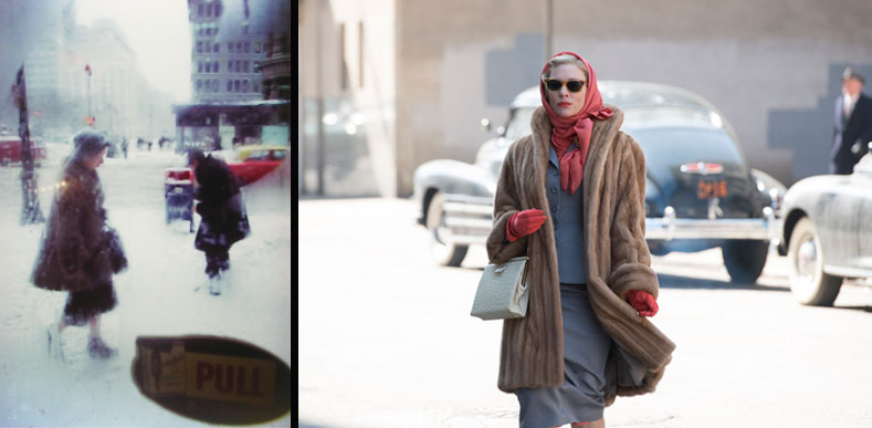 Similar color palette: An image by Saul Leiter (left) and a still from Carol (right)