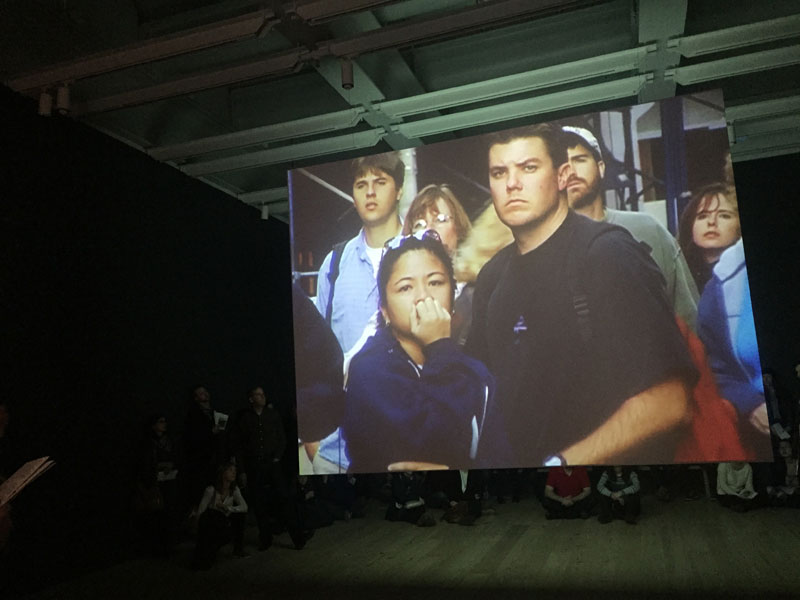 On one side of O’Say Can You See, footage shows people looking at Ground Zero. Image (c) Sarah Coleman