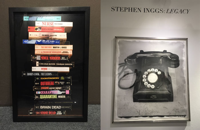 Old tech, fetishized: Books by Nina Katchadourian and a rotary phone by Stephen Inggs.