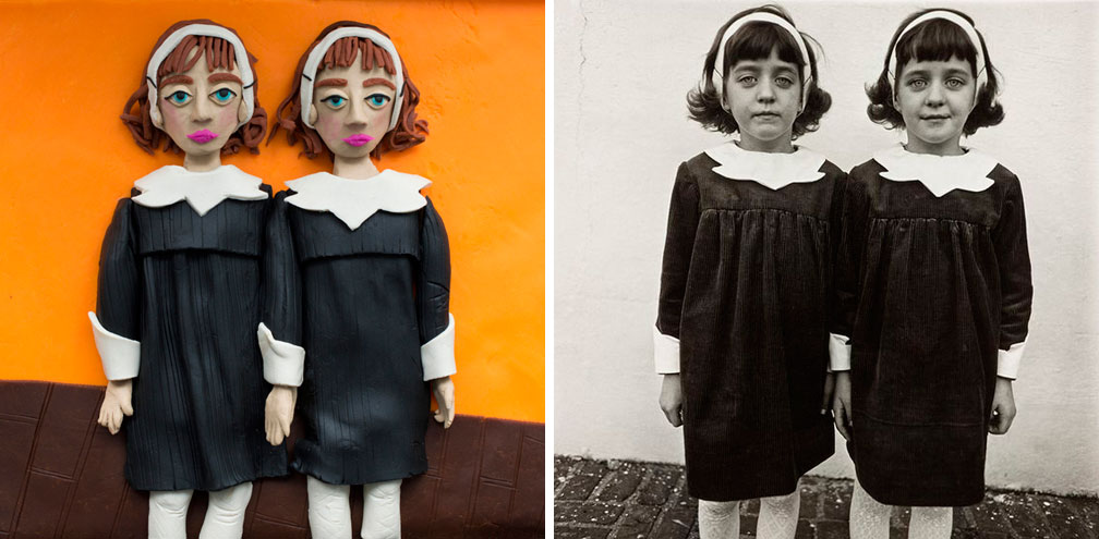 Diane Arbus’s iconic image of identical twins in Roselle, New Jersey (right) reinterpreted in Play-Doh by Eleanor Macnair