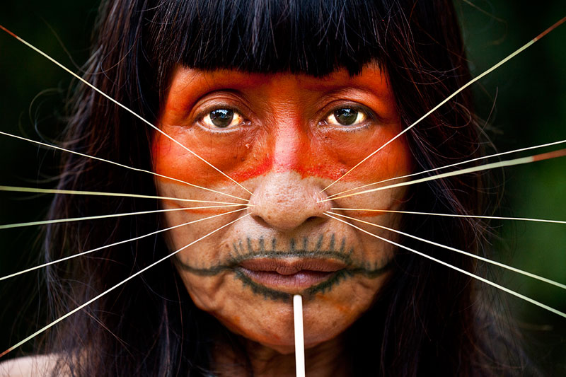 A Mayoruna Indian. The Mayoruna are also known as Matsés, or Cat People, for the spikes they insert in their faces.